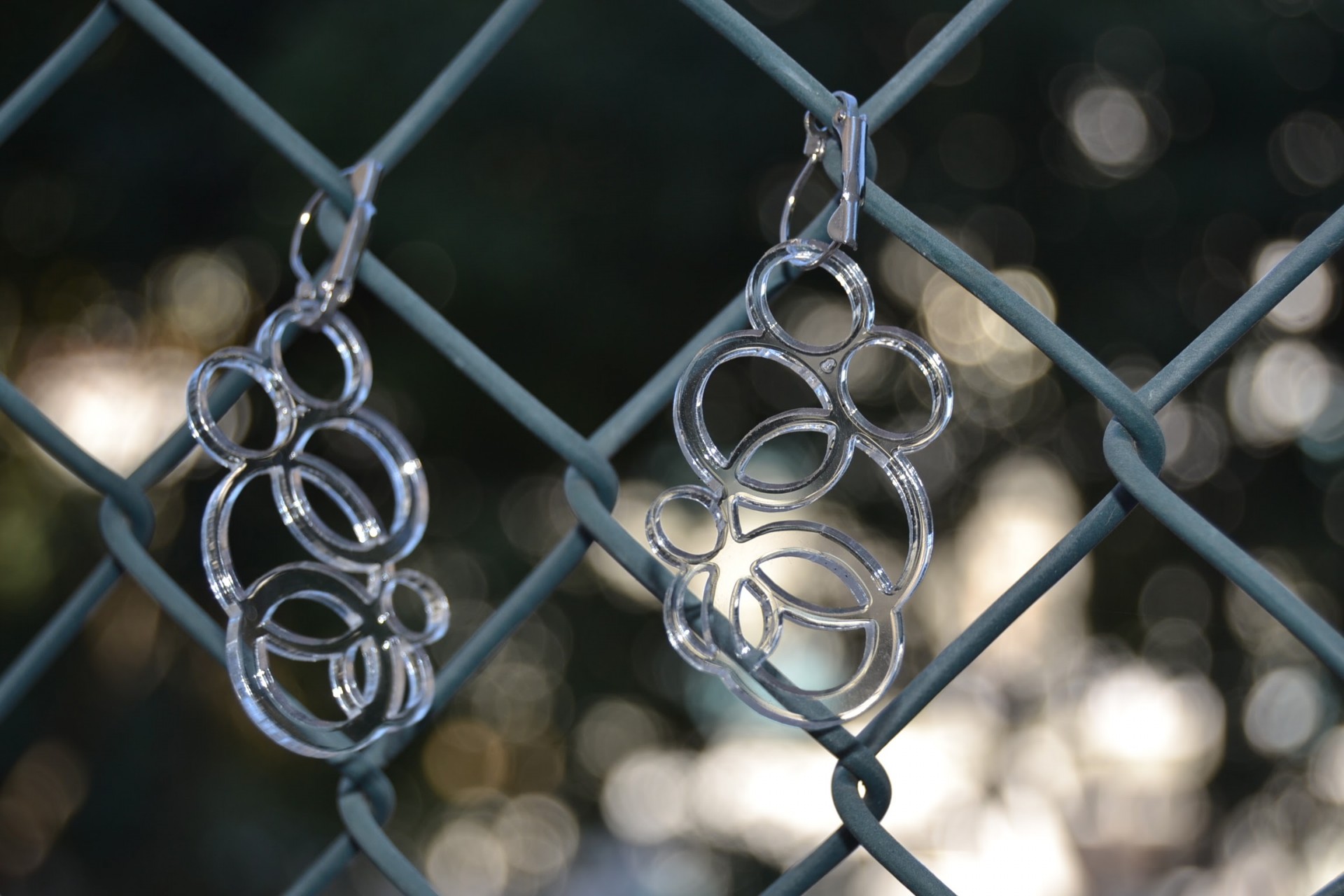 Brinco em acrílico transparente, motivo circulos com 5cm de altura e fechos em metal cromado.