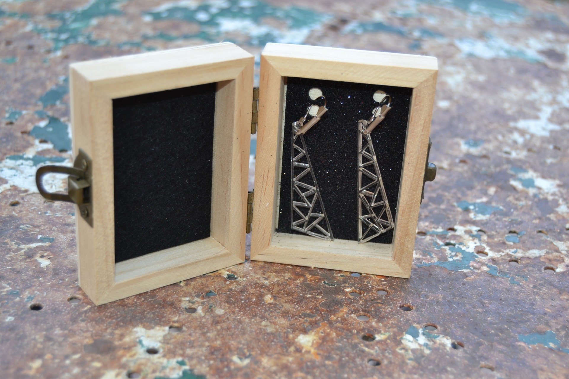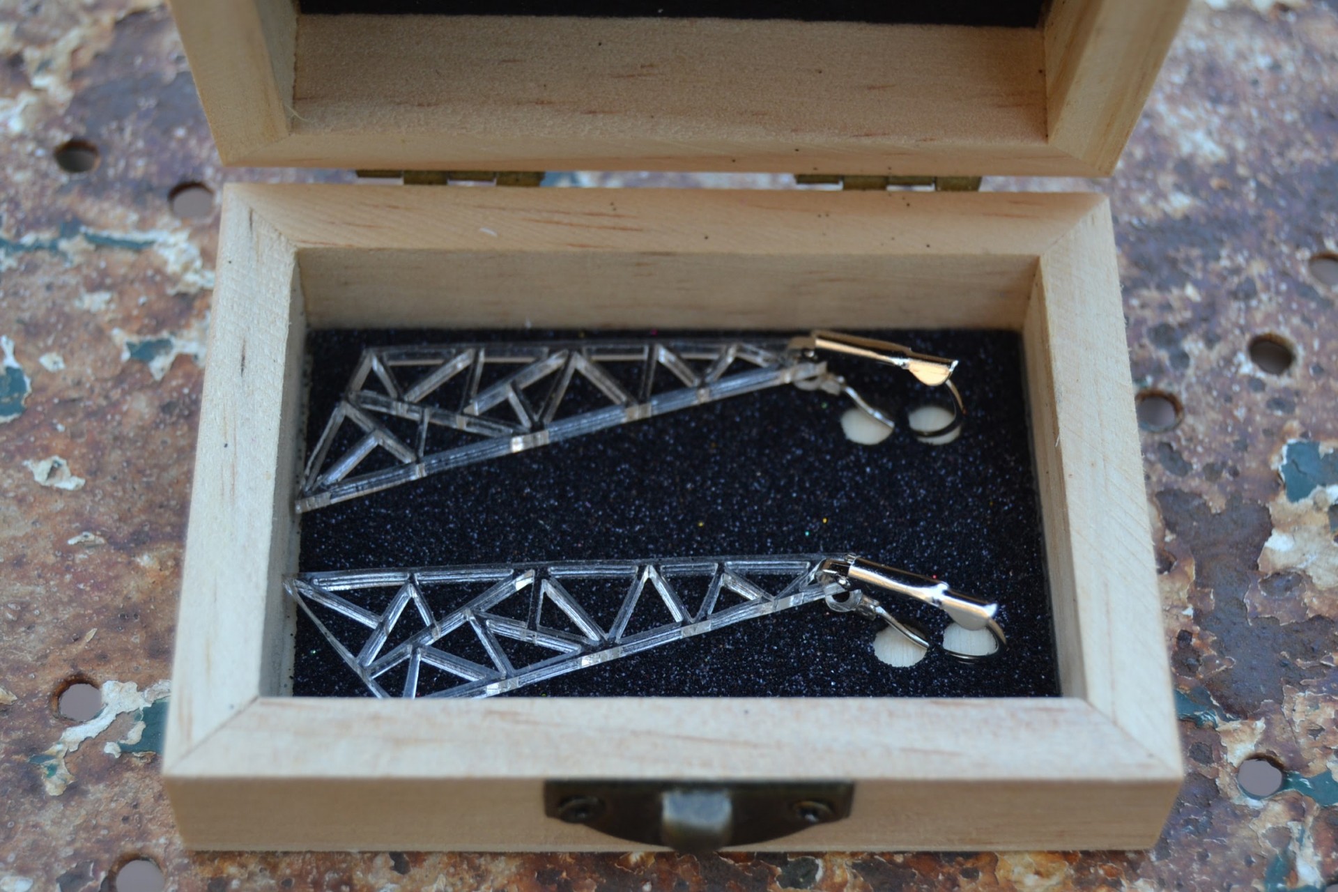 Brinco em acrílico transparente, motivo Triangulos com 5cm de altura e fechos em metal cromado.