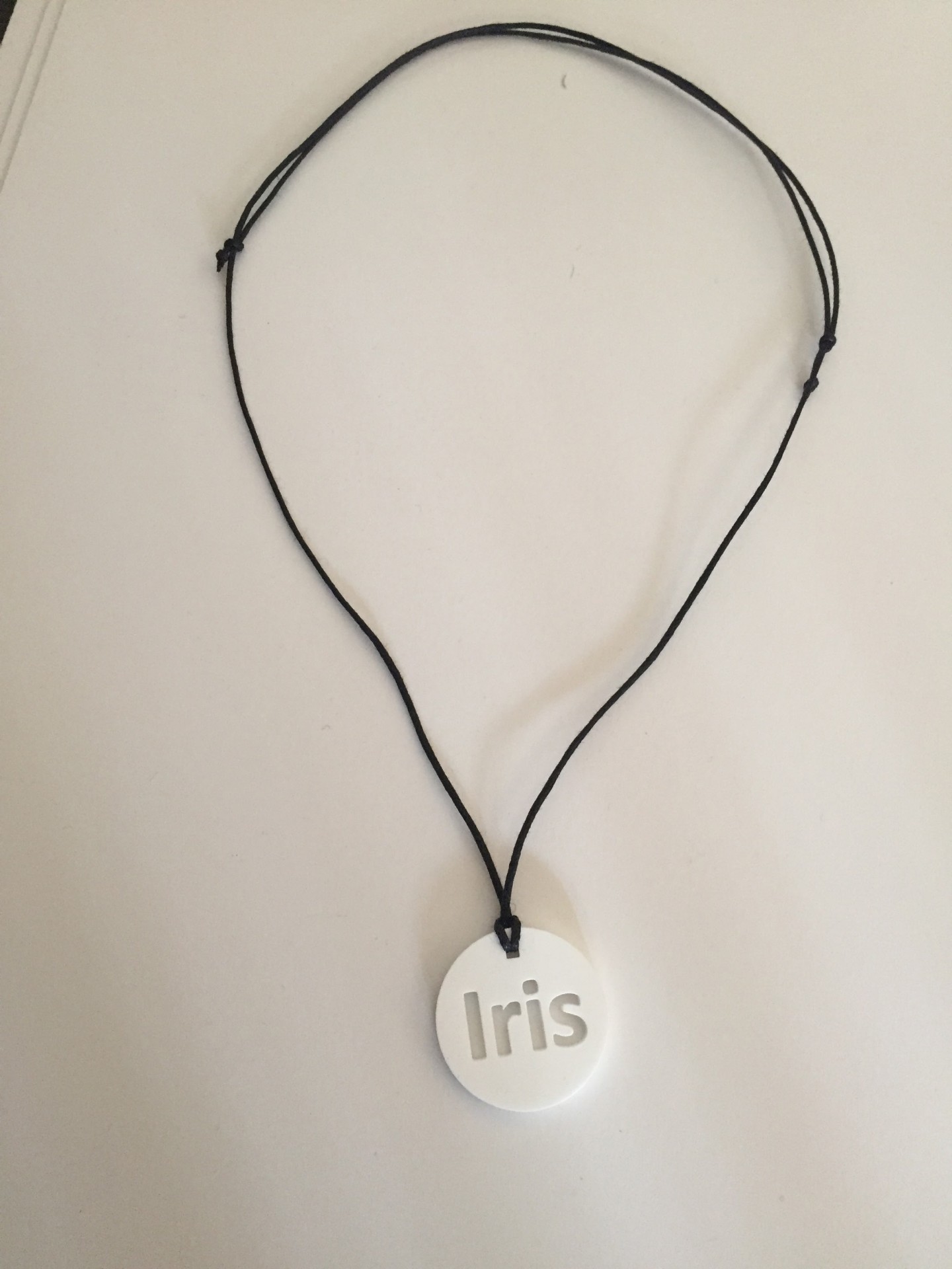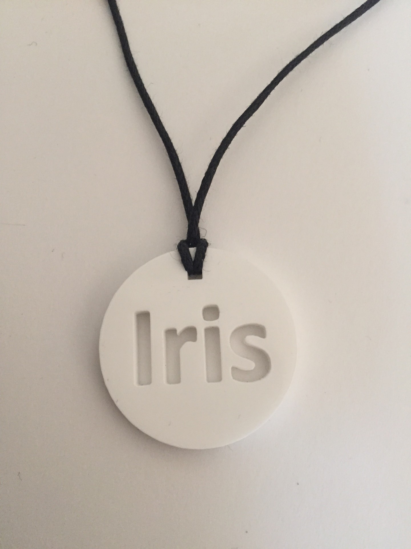 Pendente pescoço em acrílico recortado com nome. Diametro 3cm, expessura 3mm e fio de algodão encerado preto.